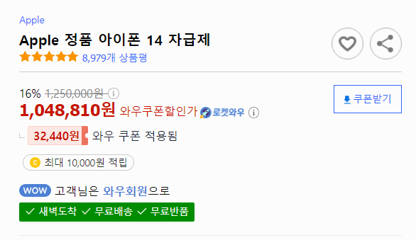 다나와 사이트에서 구입 시 쿠팡 사이트 또한 다나와 사이트에 포함되어 있지만 쿠팡 사이트에서 직접 확인하는 금액과 다나와 사이트에서 쿠팡 아이폰 14프로 가격은 위에 사진과 같이 로켓 와우 회원 할인으로 가격적인 차이가 있으니 꼭 두 가지 사이트를 확인하길 바랍니다.