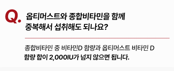 옵티머스트 관절약 제품은 1일 3정 식후 물과 함께 섭취를 권장하고 비타민 D는 옵티머스트 관절약 제품에 성분이 포함되어 있어 2,000IU가 넘지 않게 섭취하시길 추천드립니다. 섭취 전 지병이 있으신 분들은 의사와 상담 후 섭취를 권장합니다.
