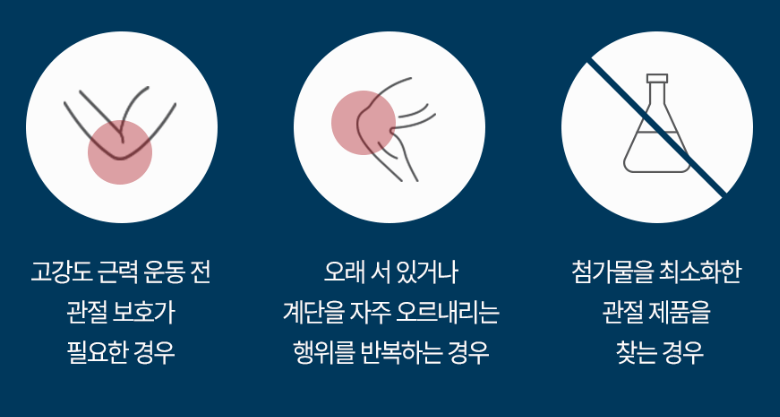 옵티머스트 관절약은 관절이 예전과 같이 매끄럽지 않고 노화로 인해 통증이 지속되거나 관절 보호가 필요하신 분들에게 추천드립니다. 9무 부형제로 첨가물이 거의 없다시피 할 정도로 첨가물을 최소화한 관절 제품을 찾으시는 분들에게도 추천드립니다.