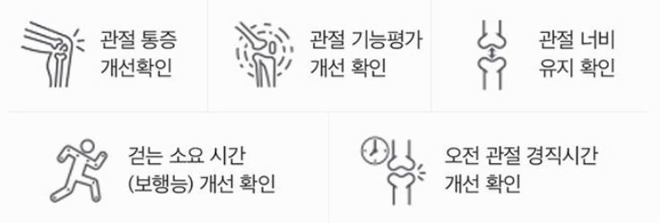 위에 사진은 콘드로이친 1200mg 인체적용 시험결과 사진으로 관절사이 평균 너비 유지 확인, 관절 통증평가 점수(VAS) 유의적 개선 확인, 양쪽 무릎에 대한 관절 통증 및 기능평가 점수 유의적 개선 확인에 대한 인체적용 시험결과입니다.