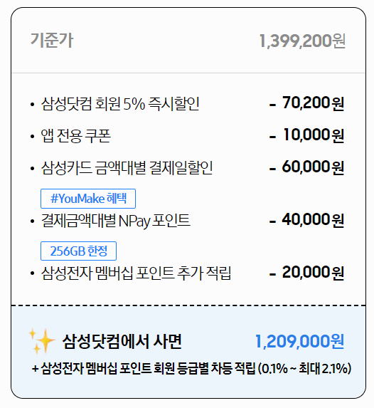 다만 삼성닷컴에서 z플립 5 구입 시 현금으로 즉시 할인이 아닌 NPay포인트, 멤버십 포인트 추가 적립으로 할인을 해주기 때문에 z플립 5 삼성닷컴 전용 색상을 구입하는 게 아니라면 공홈 구입은 추천드리지 않습니다.